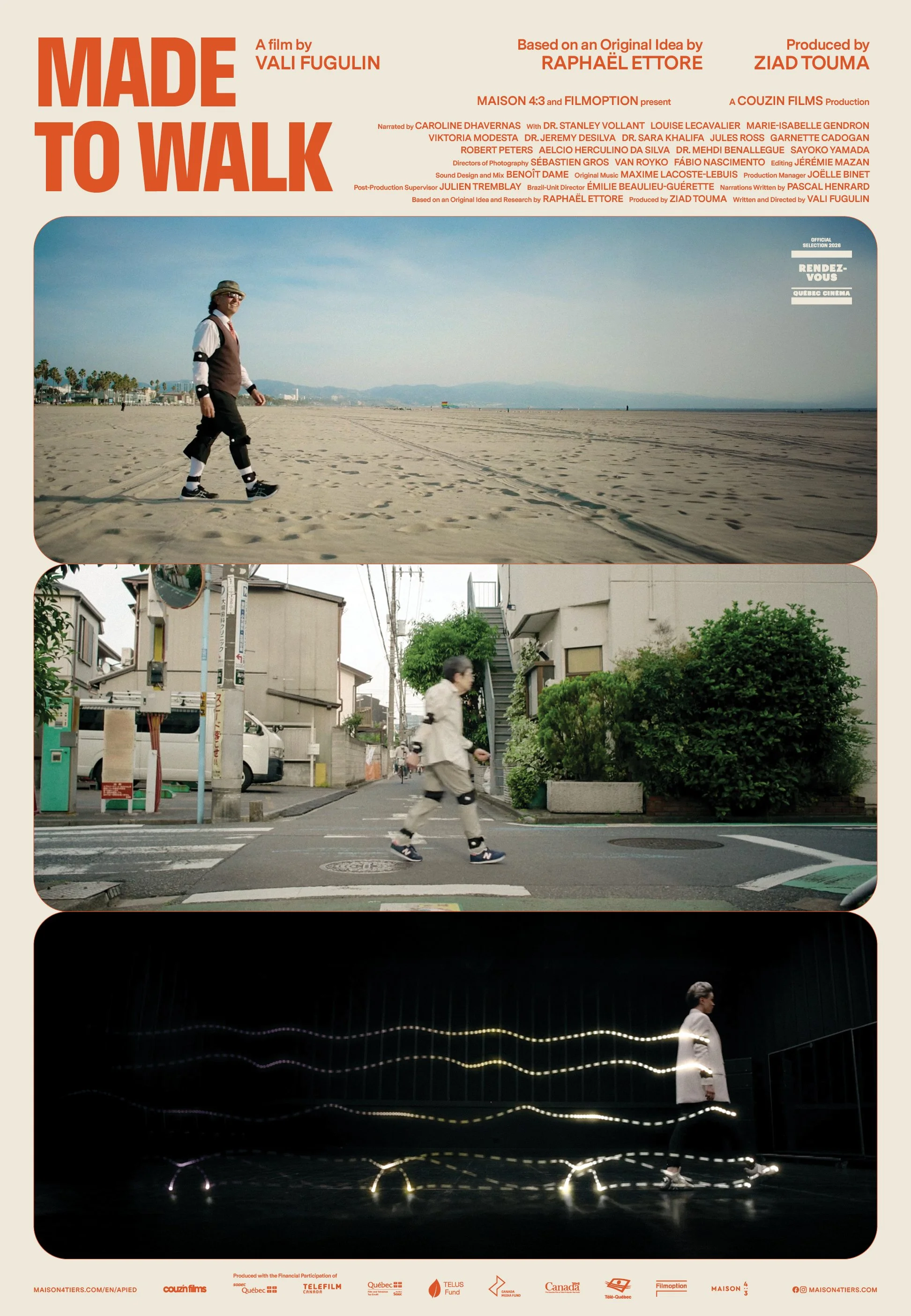 Made To Walk explores this question through intimate encounters with a gallery of extra/ordinary individuals — walkers and scientists — who reclaim or redefine walking as a way to reconnect with themselves. In a world that is increasingly sedentary, virtual, and fragmented, they each, in their own way, resist gravity, imbalance, the loss of identity, direction, or the experience of grief, by responding to the vital and inevitable call to stand and move on two feet.