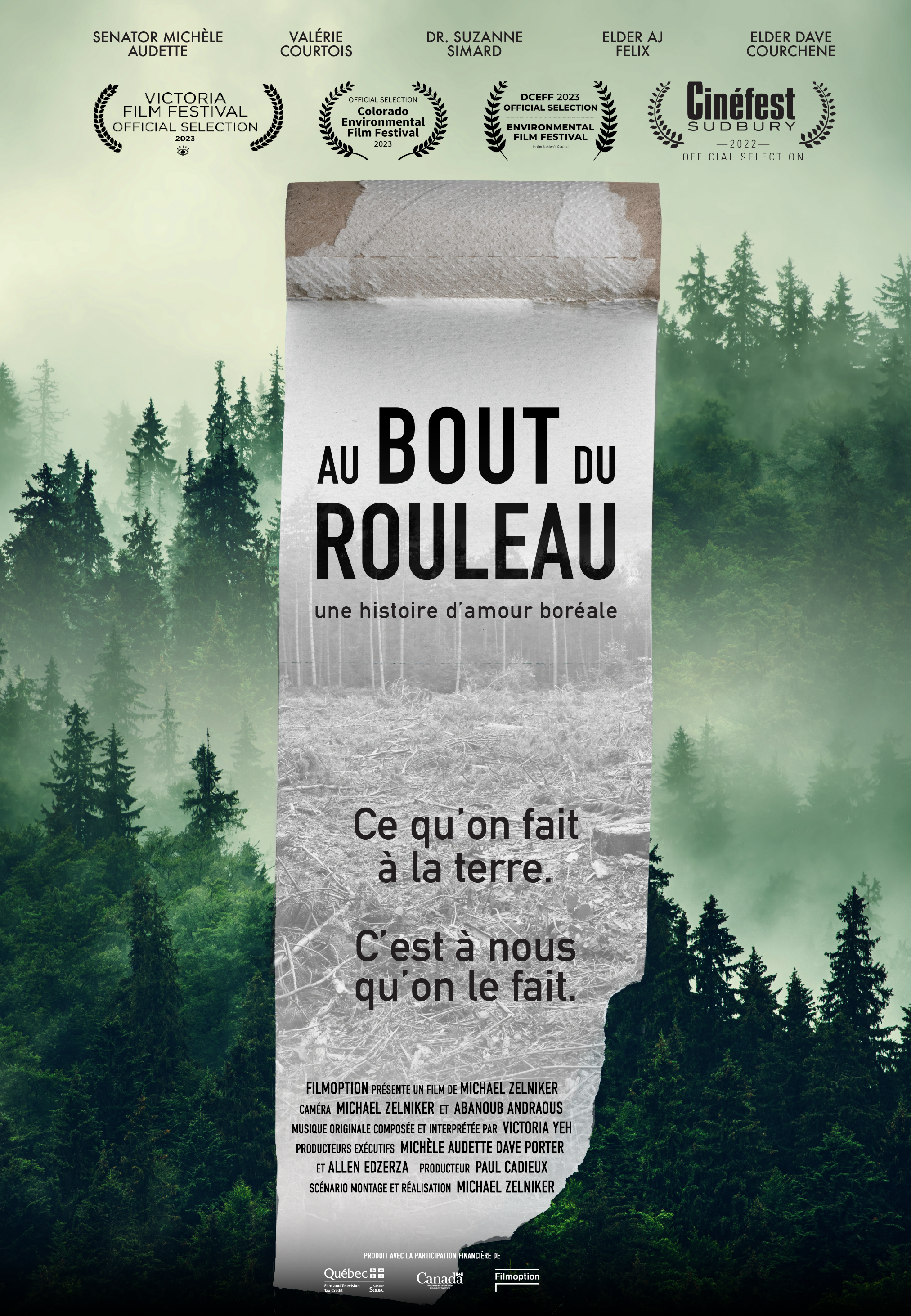 Au bout du rouleau – une histoire d’amour boréale documente l'histoire peu connue et essentiellement non racontée de la forêt boréale, des Premières Nations qui y vivent et de sa coupe à blanc pour la fabrication du papier hygiénique. La protection de cette forêt est un impératif existentiel pour la survie de l'humanité.